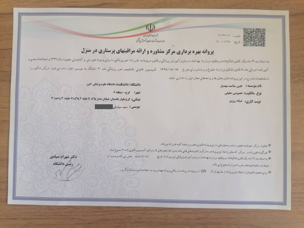 مرکز مشاوره و مراقبت های پرستاری در منزل طنین سلامت البرز کلیه خدمات پزشکی و سلامت در منزل را همراه با کادر مجرب و مجوز رسمی از دانشگاه علوم پزشکی البرز ارائه میدهد.